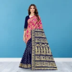 The Midnight Navy Blue silk base glistens with golden paisley butis, like twinkling constellations across a midnight sky. Below, a rich woven border with dancing apsaras and animal motifs adds layers of traditional symbolism. The Fuchsia Pink drape over the shoulder, detailed with blooming golden vines, introduces a royal contrast, enhancing bridal aura and temple poise alike .