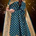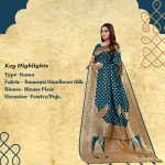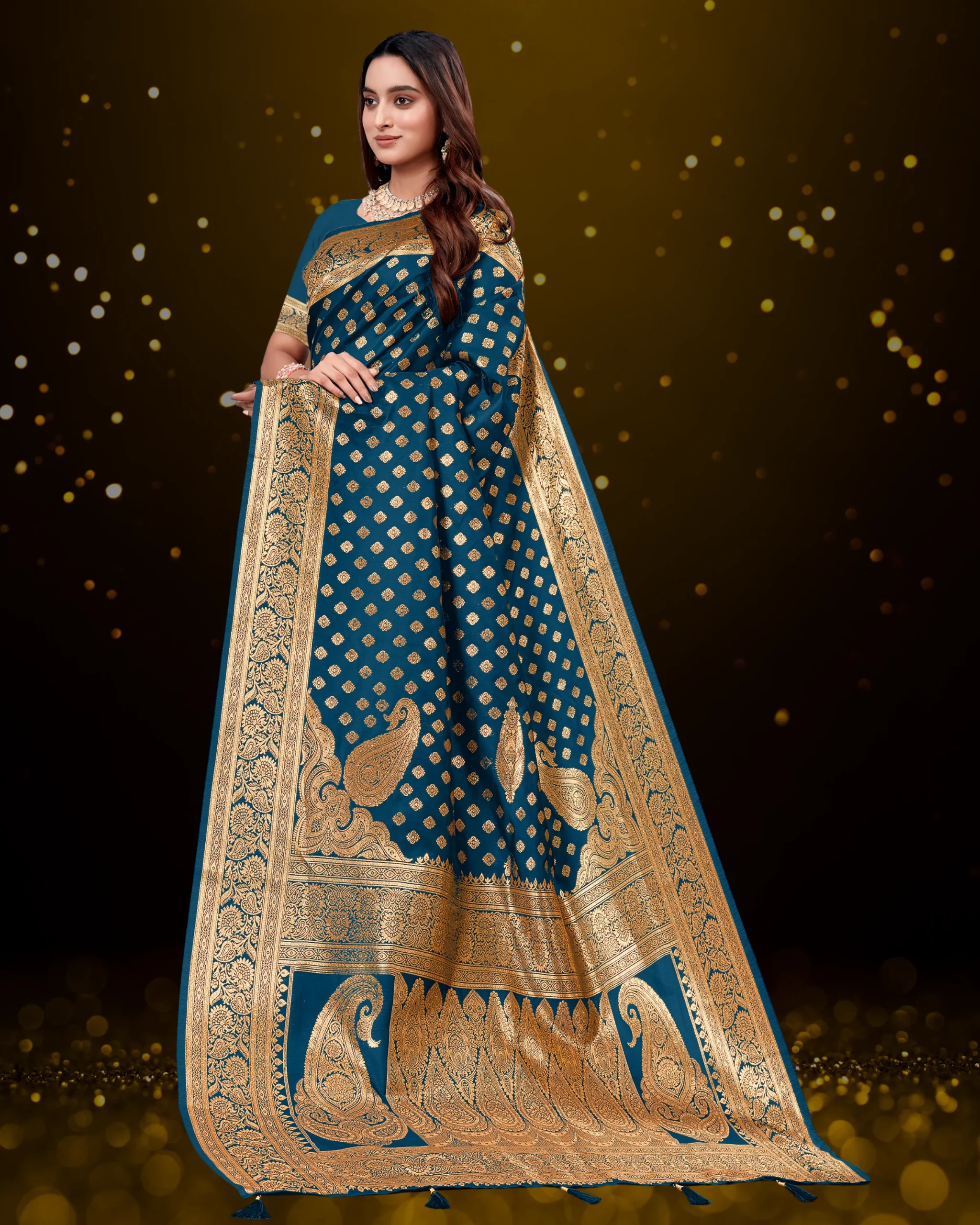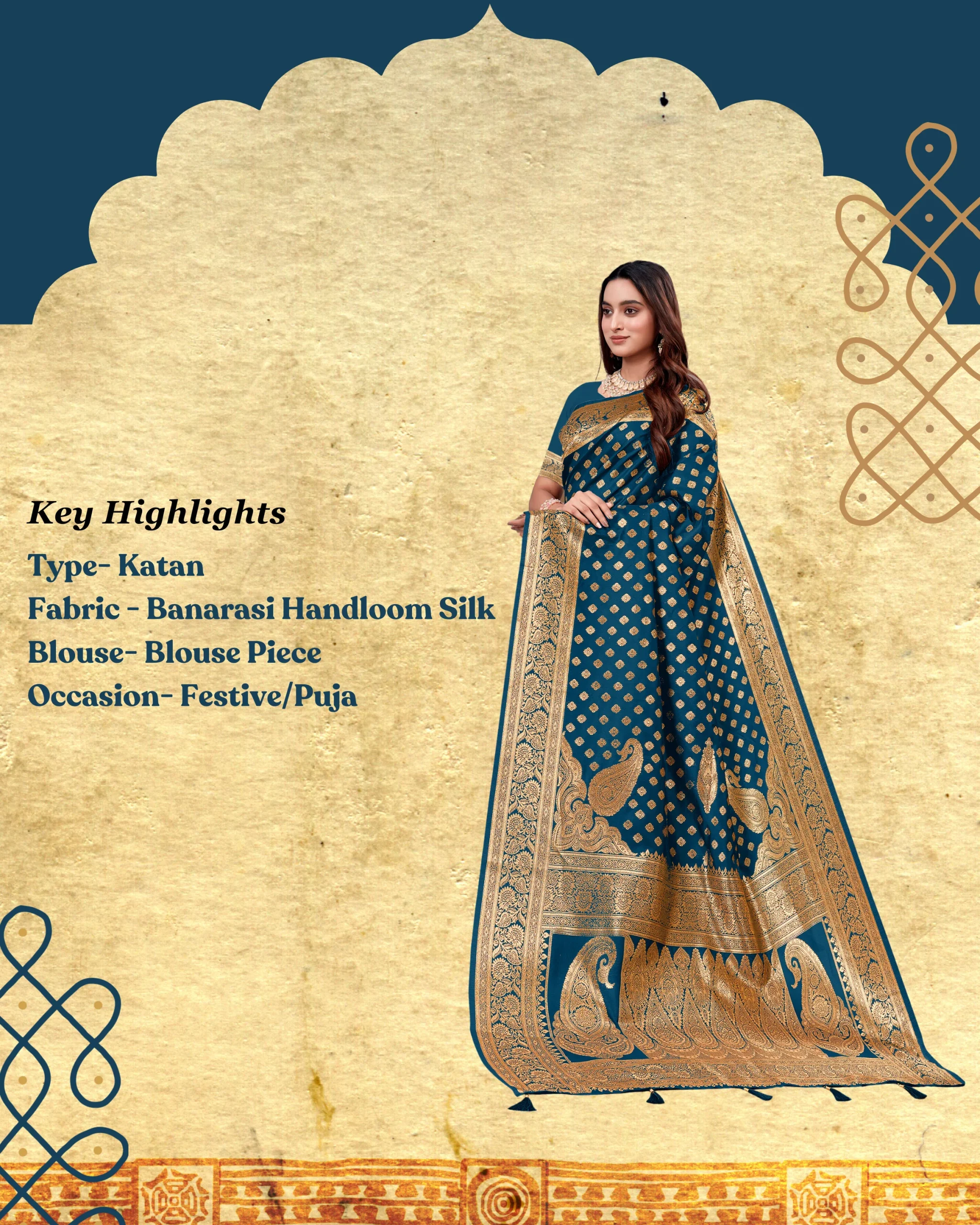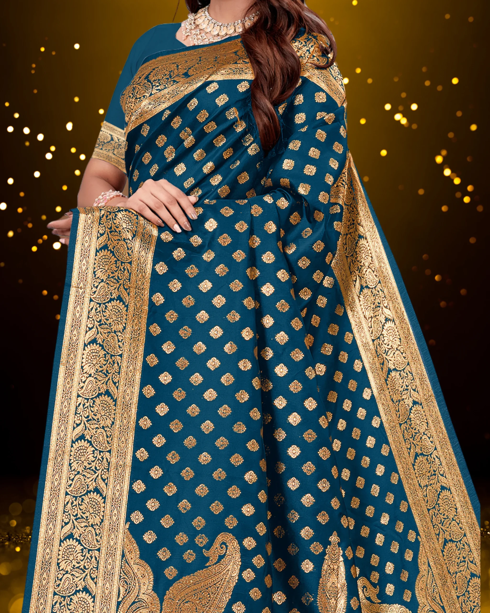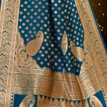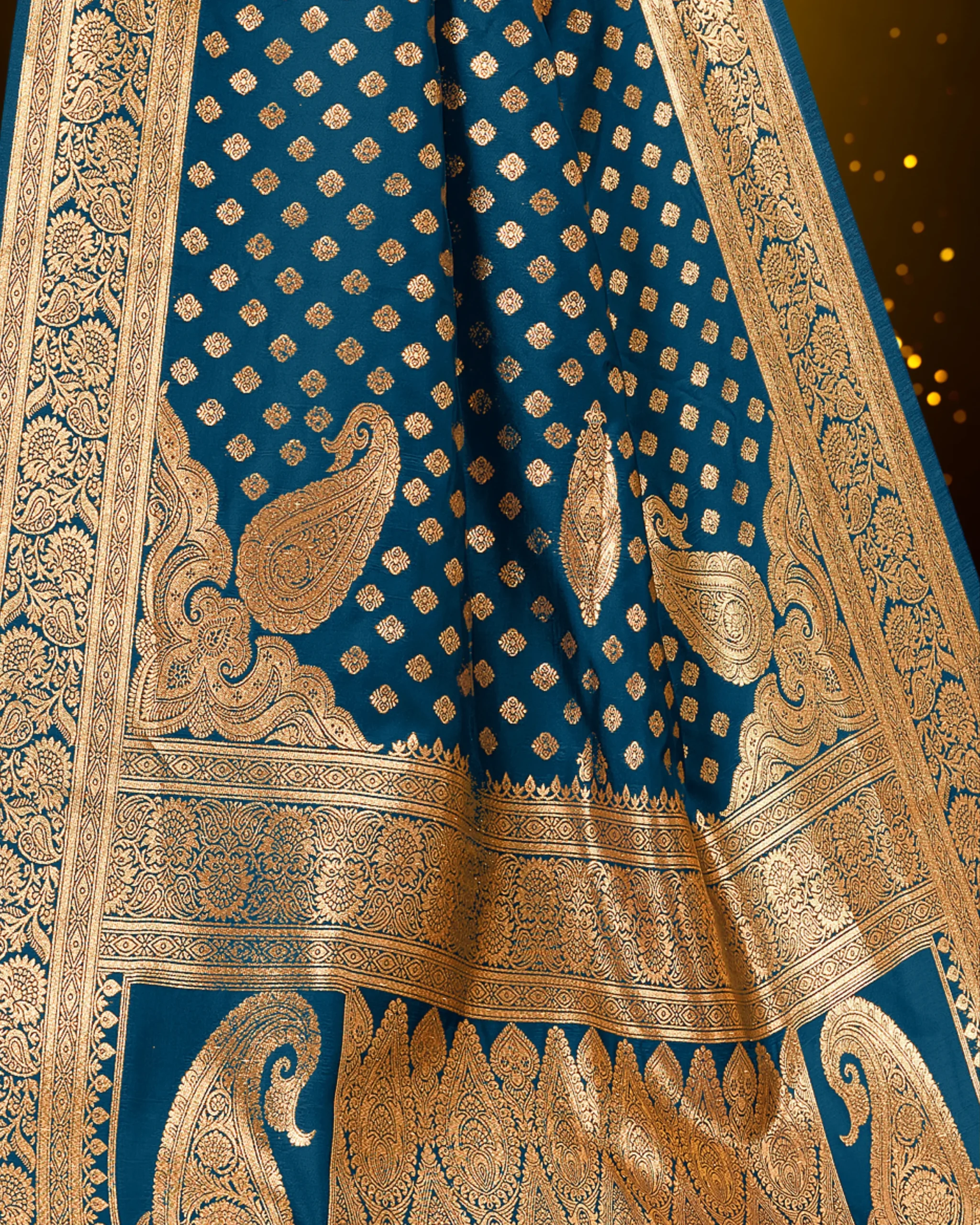 Work Type– Drape yourself in heirloom-worthy glamour with this Peacock Teal Banarasi Soft Silk Saree — where Varanasi’s age-old zari craft meets modern couture sensibility. The deep peacock teal base provides a luminous backdrop to uniform golden buti motifs that shimmer with every movement. A wide, intricately woven zari border frames the saree, while the grand pallu features layered paisley (kairi) panels and temple-inspired motifs executed in heavy zari for a dramatic, ceremonial finish.